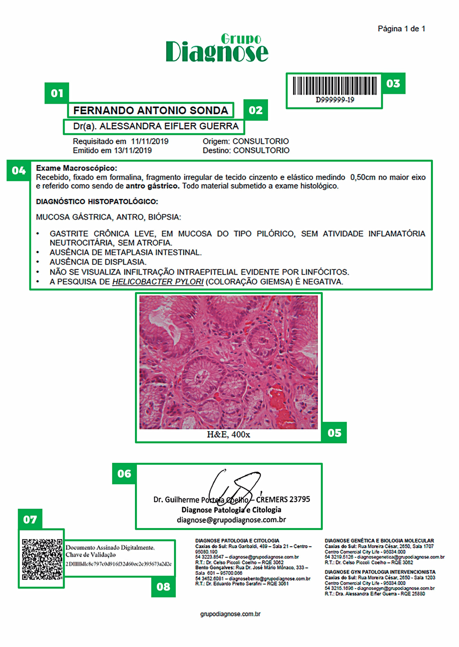 Cabe salientar que um carimbo impresso de assinatura digitalizada, isoladamente, não tem valor, quer em impressão física, quer em meio eletrônico; não garantindo segurança ao tratamento fundamentado nas informações de um laudo anatomopatológico com essas características.
